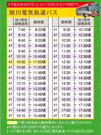 運行期間 2013年4月27日~11月3日までは、北海道中央バスで旭山動物園日帰りコースが