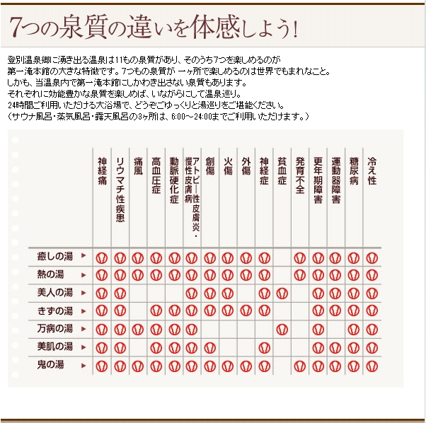 私が過去、沢山の泉質を楽しめたのは、1500坪の大浴場で、美人の湯、美肌の湯、癒しの湯、きずの湯、万病の湯、など、泉質・泉温の異なる男女合わせて35もの湯船があり(男18・女17)、があるからだそうです。