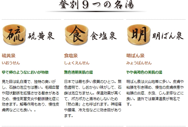 は豊富で1日1万トン源泉温度45℃~90℃の高温9種類もの